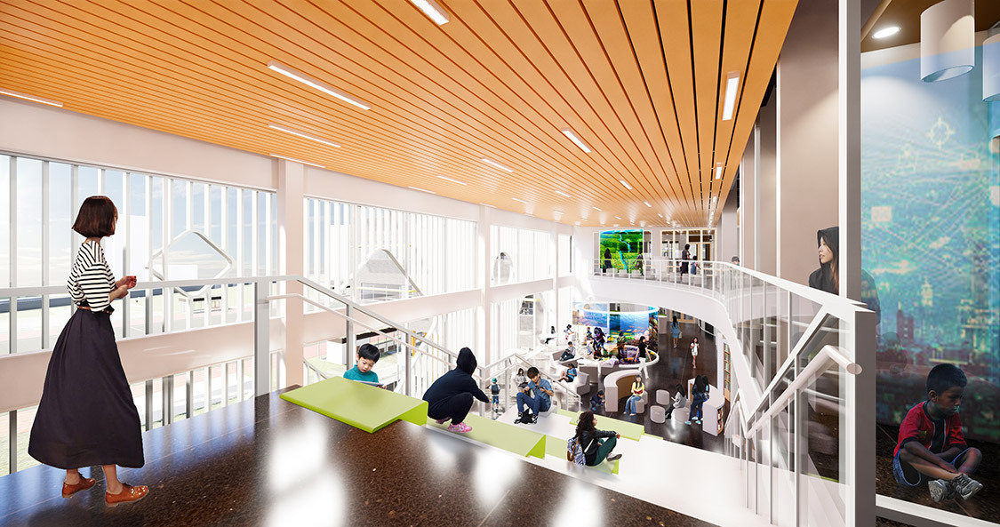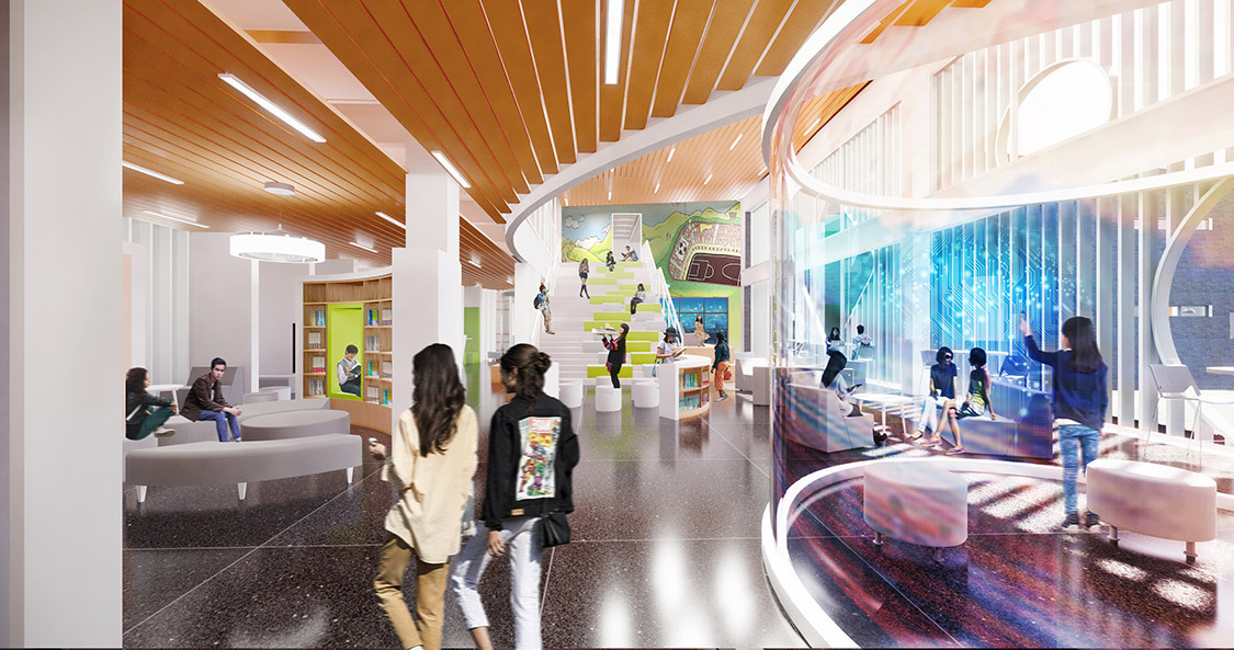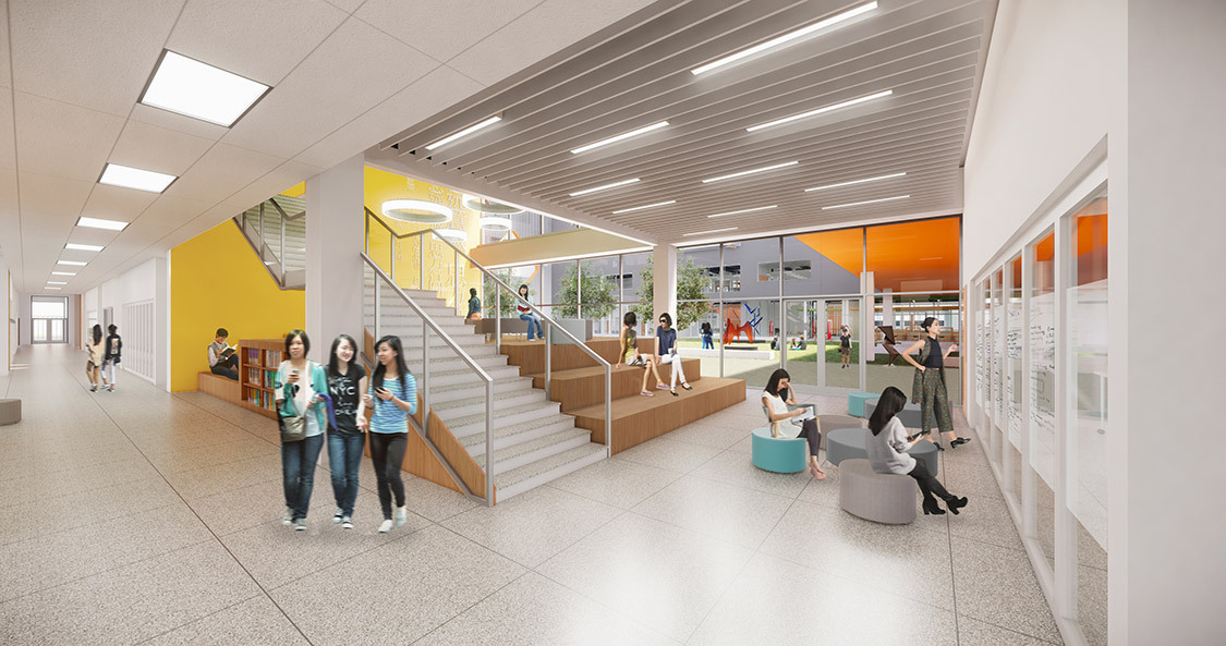 该建筑的设计创造了一个流畅性,来做为学生和教师在核心学术空间、开放式项目工作区、社交聚会场所,小组/个人学习摊位以及各种选修课程之间无缝移动。 良好连接、灵活的共享空间位于更正式的学习区域附近,使教师和学生能够轻松地从全班教学至小组学习或个人学习。 创客空间和科学实验室的战略位置是作为STEM学习的创意中心,并鼓励跨学科互动、协作和实践学习。